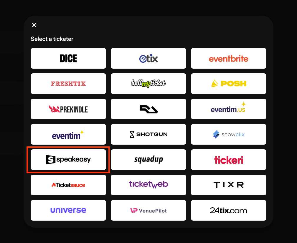 4. Click **Connect with a ticketer**, select Speakeasy, and on the popup screen, click on **Get started.**